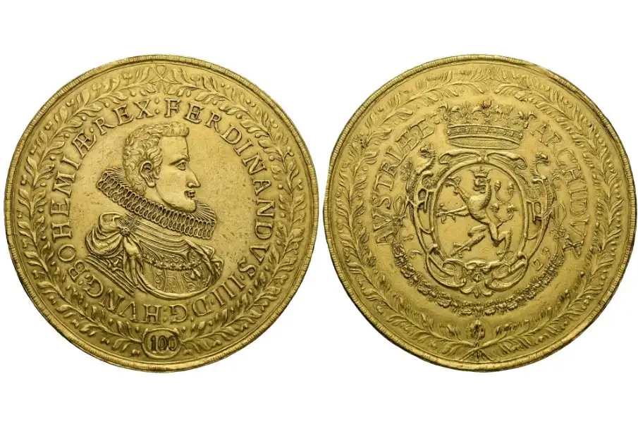 • 100 Ducat Gold Coin of Ferdinand III (1629) — Minted when Ferdinand III ruled as Archduke of Austria and King of Hungary, this colossal 348.5-gram coin is one of the largest European gold denominations ever struck.