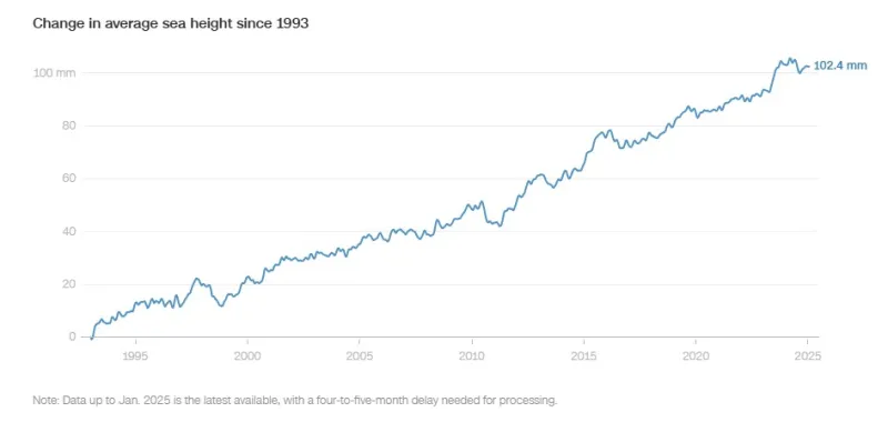 NASA explains that the main causes of rising seas are meltwater from ice sheets and glaciers, along with the expansion of warming seawater. Since 1993, average global sea level has increased by four inches, and the trend is only accelerating.